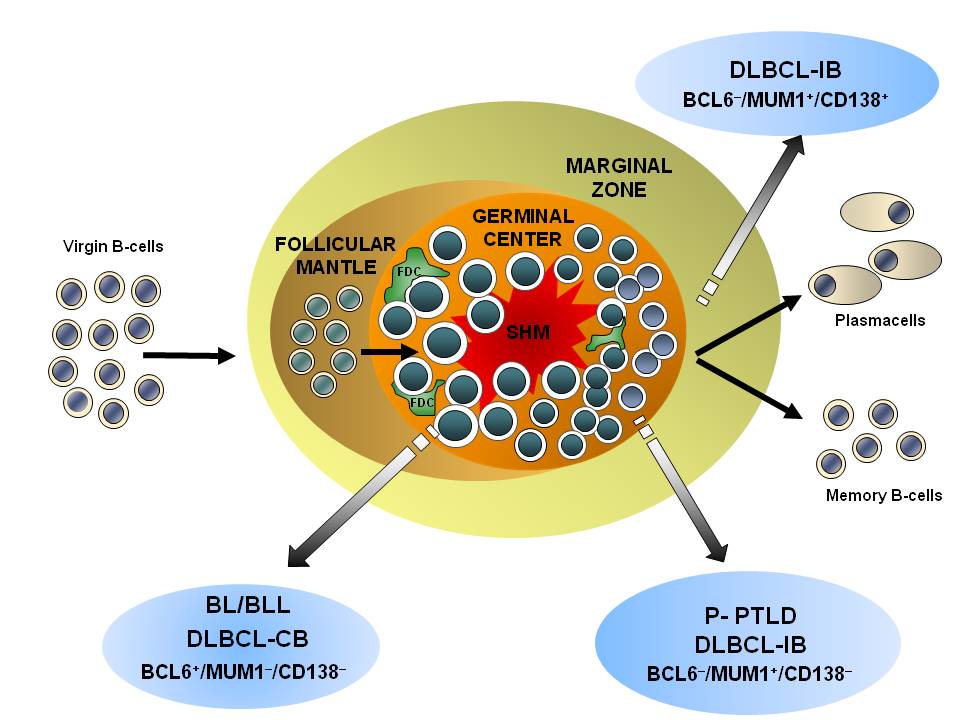 Post-transplant lymphoproliferative disorders (PTLD) are a life-threatening complication of solid organ transplantation or, more rarely, hematopoietic stem cell transplantation. The majority of PTLD is of B-cell origin and associated with Epstein–Barr virus (EBV) infection. PTLD generally display involvement of extranodal sites, aggressive histology and aggressive clinical behavior. The molecular pathogenesis of PTLD involves infection by oncogenic viruses, namely Epstein-Barr virus, as well as genetic or epigenetic alterations of several cellular genes. At variance with lymphoma arising in immunocompetent hosts, whose genome is relatively stable, a fraction of PTLD are characterized by microsatellite instability as a consequence of defects in the DNA mismatch repair mechanism. Apart from microsatellite instability, molecular alterations of cellular genes recognized in PTLD include alterations of cMYC, BCL6, TP53, DNA hypermethylation, and aberrant somatic hypermutation of protooncogenes. The occurrence of IGV mutations in the overwhelming majority of PTLD documents that malignant transformation targets germinal centre (GC) B-cells and their descendants both in EBV–positive and EBV–negative cases. Analysis of phenotypic markers of B-cell histogenesis, namely BCL6, MUM1 and CD138, allows further distinction of PTLD histogenetic categories. PTLD expressing the BCL6+/MUM1+/-/CD138- profile reflect B-cells actively experiencing the GC reaction, and comprise diffuse large B-cell lymphoma (DLBCL) centroblastic and Burkitt lymphoma. PTLD expressing the BCL6-/MUM1+/CD138- phenotype putatively derive from B-cells that have concluded the GC reaction, and comprise the majority of polymorphic PTLD and a fraction of DLBCL immunoblastic. A third group of PTLD is reminiscent of post-GC and preterminally differentiated B-cells that show the BCL6-/MUM1+/CD138+ phenotype, and are morphologically represented by either polymorphic PTLD or DLBCL immunoblastic.
