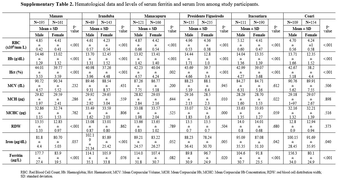 Supplementary Table 2. Hematological data and levels of serum ferritin and serum Iron among study participants.
