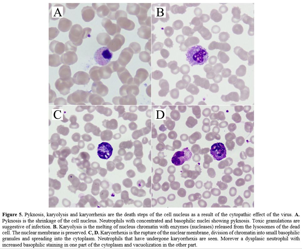 atypical lymphocytes, monocytes with vacuoles, bands, and pyknotic