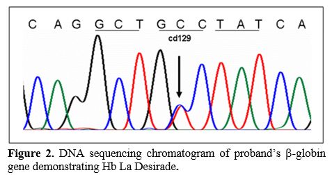 Figure 2. DNA sequencing chromatogram of proband’s β-globin gene demonstrating Hb La Desirade.
