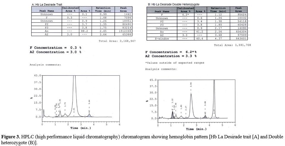 their HPLC also did not show any abnormality with normal HbA, HbA2, and HbF since Hb La Desirade elutes along with HbA (Figure 2).