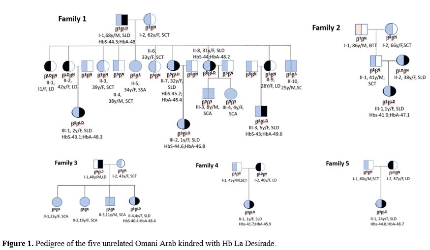 Figure 1. Pedigree of the five unrelated Omani Arab kindred with Hb La Desirade. |
