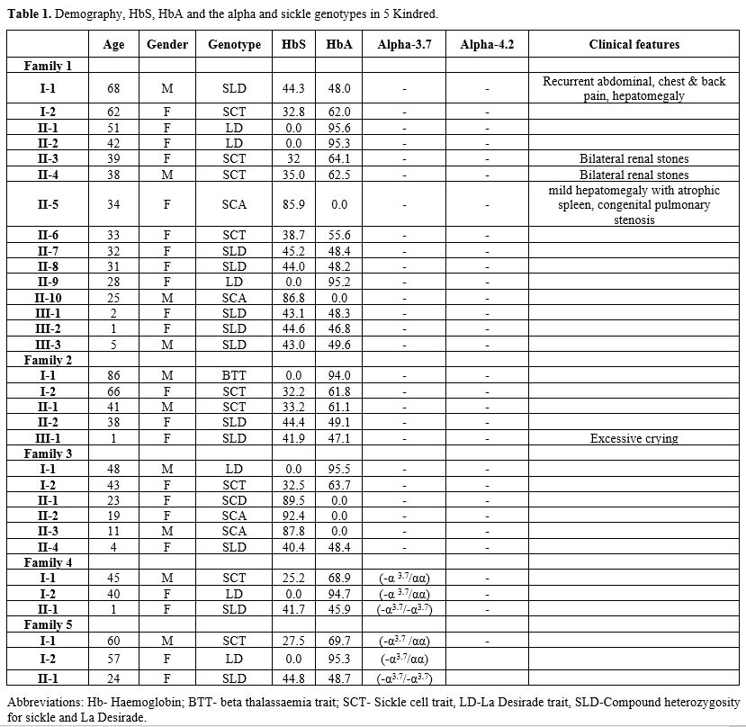 Table 1. Demography, HbS, HbA and the alpha and sickle genotypes in 5 Kindred. |