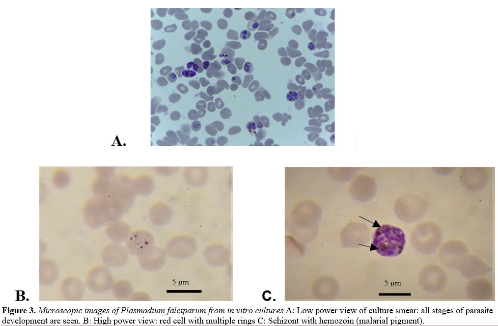 Figure 3 Figure 3. Microscopic images of Plasmodium falciparum from in vitro cultures A: Low power view of culture smear: all stages of parasite development are seen. B: High power view: red cell with multiple rings C: Schizont with hemozoin (malarial pigment).