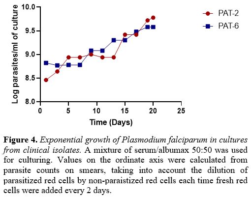 : We have successfully achieved exponential growth of existing strains that are used worldwide, as well as of parasites in clinical samples from patients with acute malaria. In the aim to optimize growth we have compared human serum and bovine serum albumin as components of the culture media. Additionally, culture synchronization has been achieved using sorbitol.