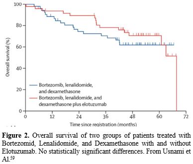 Considering that there are many MM with circulant neoplastic plasma cells, which are a significant risk factor, and have a prognosis not so different from plasma cell leukemia,[8-11] there is a tendency not to consider the PCL a distinct entity, but to classify it in a group of ultra-high-risk (UHR) myeloma together with the extramedullary myelomas and multi-hit myeloma (the co-occurrence of two or more high-risk cytogenetic abnormalities), extramedullary disease, plasma cell leukemia, and a high-risk gene expression profiling signature have emerged as defining features of ultrahigh- risk multiple myeloma (uHRMM).[58] Consequently, in some recent trials, the pPCLs were classified together with high-risk molecular features MM. The SWOG 1211 trial randomly assigned MM patients with high-risk molecular features (t(14;16), t(14;20), del(17p), ampl(1q21) or pPCL to treatment with VRD (bortezomib/Velcade, lenalidomide/Revlimid, and dexamethasone) alone or in combination with elotuzumab (RVD-E); however, RVD-E treatment failed to improve PFS over RVD (median PFS 31.5 vs 36.4 months) (Table 3 and Figure 2).[59]![]() |