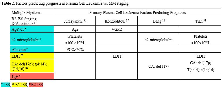 As in classical multiple myeloma, pPCL prognosis is influenced by host characteristics, tumor burden (stage), biology (including cytogenetic abnormalities), and response to therapy. The existing risk models for multiple myeloma (MM) are suboptimal for stratifying patients with primary plasma cell leukemia (pPCL), considering that the percentage of circulating plasmablasts is not included among the parameters of all types of R-ISS;[34] it is currently considered a significant sign that worsens the prognosis.[11,24,34] So, a proportion of patients with PCL remain in stages I and II.[12,15,33] In general, the prognosis of pPCL is worse than that of MM, but better than that of sPCL.[14-16,28,30,32,33] However, not all pPCL have the same prognosis; therefore, over the last few years, several proposals have been made for specific indicators in pPCL (Table 2).[8-12,34]Therapy
