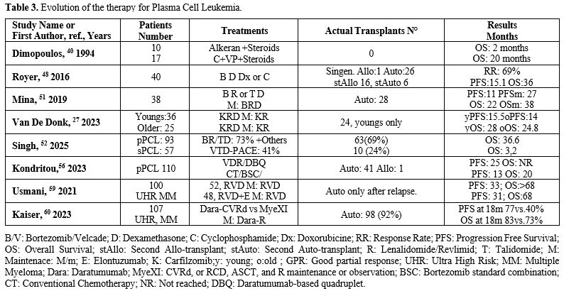 Standard therapy for myeloma has been shown for many years to be ineffective in pPCL. The median life of patients treated with melphalan, prednisone, or VAD was a few months.[39] However, in the same paper, patients treated with a high-risk lymphoma-like cycle had a median survival of 22 months (Table 3). The efficacy of hematopoietic stem cell transplantation has been well documented, even before the introduction of new drugs for MM.[40-42] We reported many years ago a patient with primary plasma cell leukemia, resistant to VAD, who went into remission with Cyclophosphamide and Vepesid and then underwent transplantation with CD34-positive selected cells. She is in complete remission and well at present, thirty years later.[41] The introduction of bortezomib was fundamental in myeloma therapy and similarly was in pPCL.[42-46] The addition of Bortezomib to Cyclophosphamide and dexamethasone improved overall survival in pPCL, particularly when combined with autologous hematopoietic stem cell transplant.[43,44] The addition of bortezomib was considered real progress.[43-48] Royer and Coll. treated 40 patients with Bortezomib, Cyclophosphamide, Doxorubicin, and Dexamethasone, observing a median OS and PFS of 36.3 and 15.1 months, respectively. The 12-month PFS was 58%, and the 12-month OS was 75%. The ORR to induction was 69%, which included VGPR or better in 36% (n = 14), and the best response achieved during the entire program was VGPR or better in 59% (n = 23).[48] Similarly, Pagano and colleagues[49] achieved a 55% CR by combining bortezomib with high-dose cyclophosphamide and double autologous stem cell transplantation (aHSCT). The median OS of patients who achieved CR was not reached, and their PFS was 50 months. Following the evolution of treatment for patients with a new diagnosis of newly diagnosed multiple myeloma (NDMM) in transplant-eligible (TE) patients,[50] the pPCL treatment has also changed.Therapy of High-Risk myeloma, including pPCL